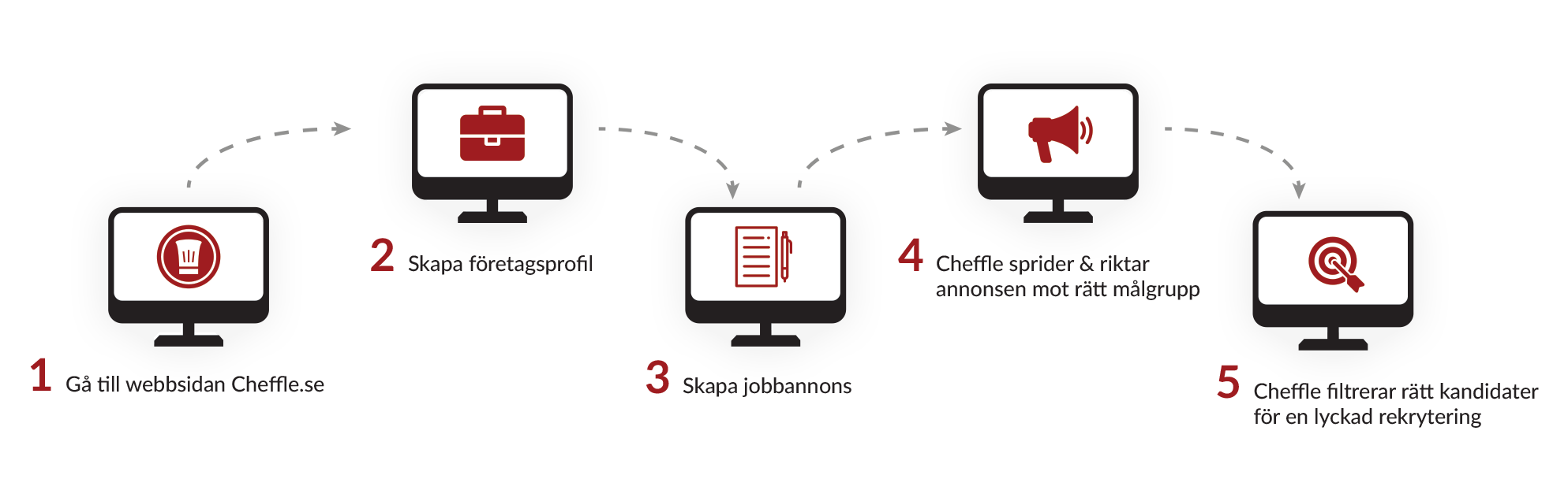 Med Cheffle får du hjälp med alla steg i din rekrytering. Att skapa en attraktiv annons som visas i rätt kanal, för rätt målgrupp. I verktyget är det även jättelätt att strukturera upp hela processen, från ansökningar till återkoppling och alla svar till kandidater. Vi är specialister på restaurangbranschens behov och ser till att du når rätt kandidater.